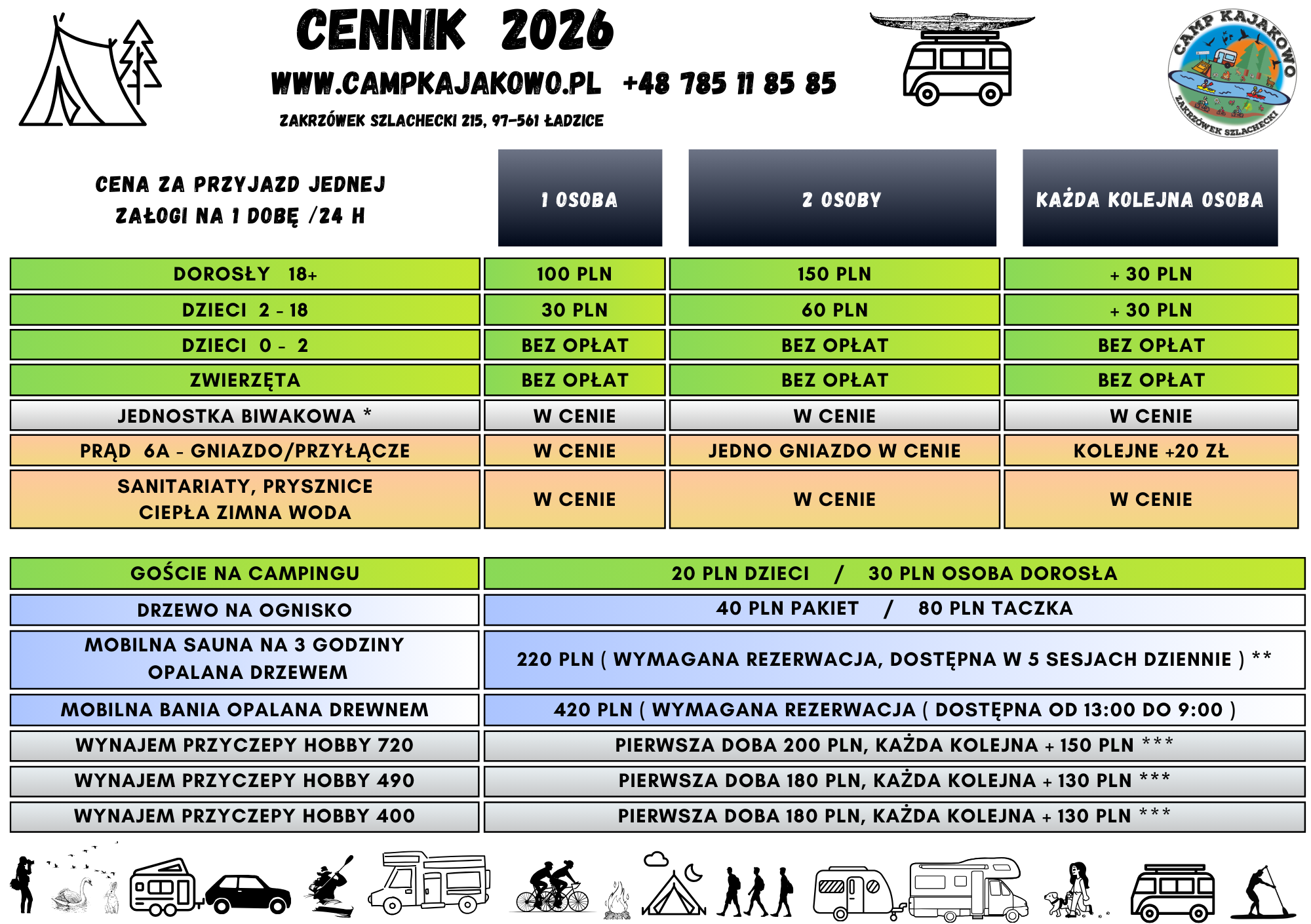 - Płacisz tylko za osoby! Jednostka biwakowa* (samochód, kamper, przyczepa, bus, motocykl, rower czy namiot) jest już wliczona w cenę pobytu.